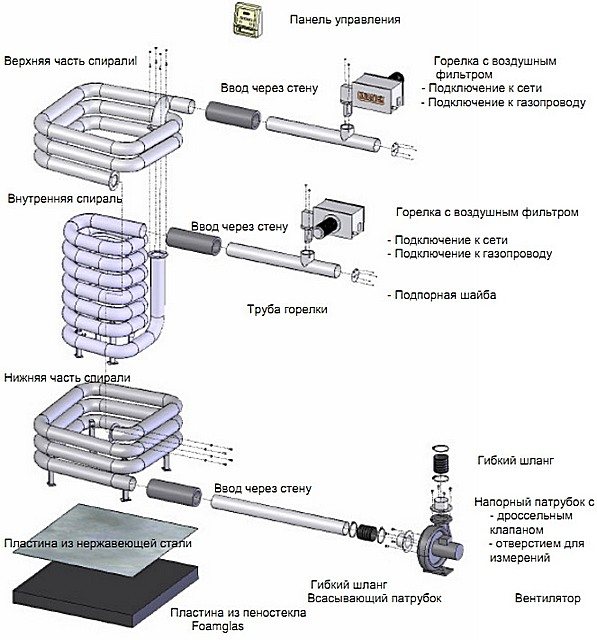 А газовите печки за баня имат напълно необичаен дизайн. Те представляват набор от специално подредени, навити тръби от легирана стомана, през които се изпомпва въздух и се отстраняват продуктите от горенето на газ.