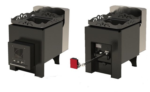 | Универсална печка на газ на дърва за баня. В газовата версия той е оборудван с горелка UG SABK-TB-16, която позволява да се използва в парни бани с обем от 8 до 16 m³. Материал - структурна или неръждаема стомана (в модификацията "Uralochka-16N") с дебелина 4 мм, а в горивната камера - 6 мм. Централно разположение на комина. Премахнатият прозорец за прием на гориво, който ви позволява да го поставите в съблекалнята. Купувачът може да избере от няколко допълнителни опции (срещу подходящо плащане): шарнирен резервоар за отопление на вода или вграден топлообменник, допълнителна решетка за нагревателя по стековете на печката, конвекторна мрежа, парогенератор. Размери на пещта: 550 (L) × 445 (W) × 730 (H) mm, теглото на основния каменен пълнеж е 60 kg. | От 13 900 рубли в комплект с GSU |