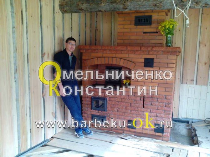Печката на снимката се отличава с комбинирана или смесена система за дим. Параметрите на този дизайн са 102x102x238 сантиметра. Топлопредаването му е равно на 4200 ккал / час.