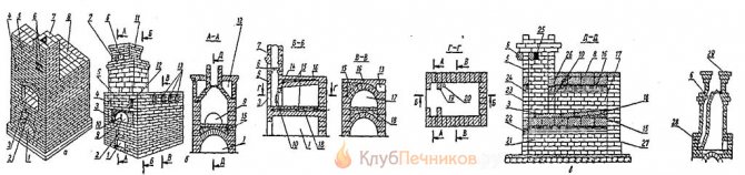 В пещите за частни домакинства е предвидена тухлена облицовка с кухини, за да се облекчи теглото на конструкцията и да се спести разход на материал. И двете части на двуетажните фурни имат абсолютно еднакъв дизайн. В такива отоплителни тела се използва безканална система за циркулация на дим. Според схемата на зидарията на печката, газовете от камината влизат в горната камбана с дюза. След охлаждане газовете се спускат и на мястото на дъното на горивната камера преминават през навиването в подредения комин.
