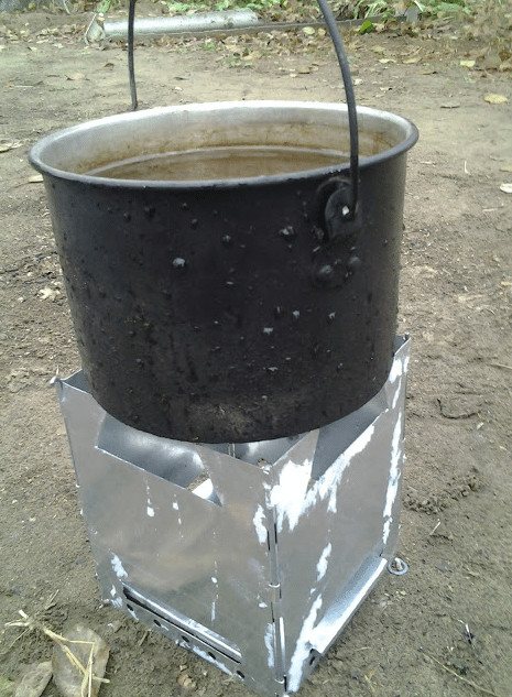 Ако туристите излязат извън града на почивка в голяма компания, инсталацията от консерви няма да им позволи да приготвят достатъчно храна за всички участници в пътуването. В този случай се препоръчва да направите печка на дърва със собствените си ръце от две неръждаеми саксии, които не се използват в домакинството.