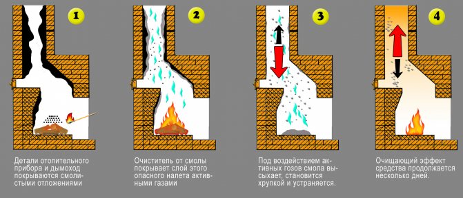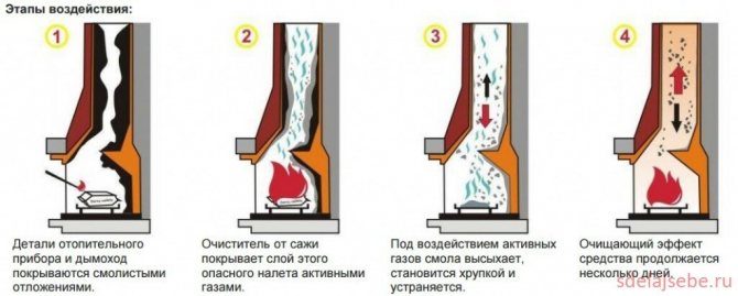 Агентът се поставя в камина или печка и се запалва. При горенето се отделят вещества, които се издигат нагоре по комина и омекотяват отлаганията на сажди. Част от сажди се изпарява с въздушни маси (през комина нагоре), част отпада в пещта на печка или камина (след това трябва да бъде премахната от вас сами).