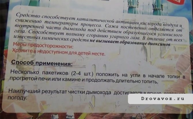 - От опита на собствениците на жилища, почистващи комина с този продукт, има смисъл да проверите комина за повреди или пукнатини преди процедурата. Температурата на изгаряне на сажди при използване на химически трупи е толкова висока, че може да създаде риск от разрушаване за дефектен комин.