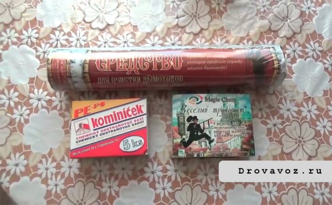 Химикалите се предлагат под формата на брикети, прах или течност. Характеристиките на най-популярните лекарства и препоръки за това как най-добре да се почисти комина от сажди са дадени по-долу.