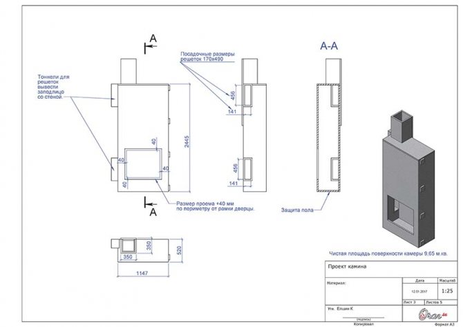 След инсталирането и свързването на камината просто трябва да поставим Super Isol под камината и да зашием предната част на конвекционната кутия. Решетките за вход и изход на въздуха са разположени от лявата странична стена в съседната стая. Размерът на решетките е 490x170 мм. Напречното сечение на решетките отговаря на изискванията на производителя на пещта и е около 700 cm2.