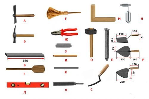 - ниво на павило и отвес за поддържане на вертикалното и хоризонталното положение на редовете и стените на сградата;
