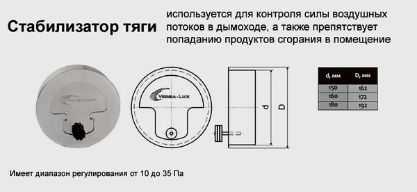 Не по-малко впечатляващите възможности на стабилизатора на комина също са впечатлени както с естествена, така и с принудителна тяга.