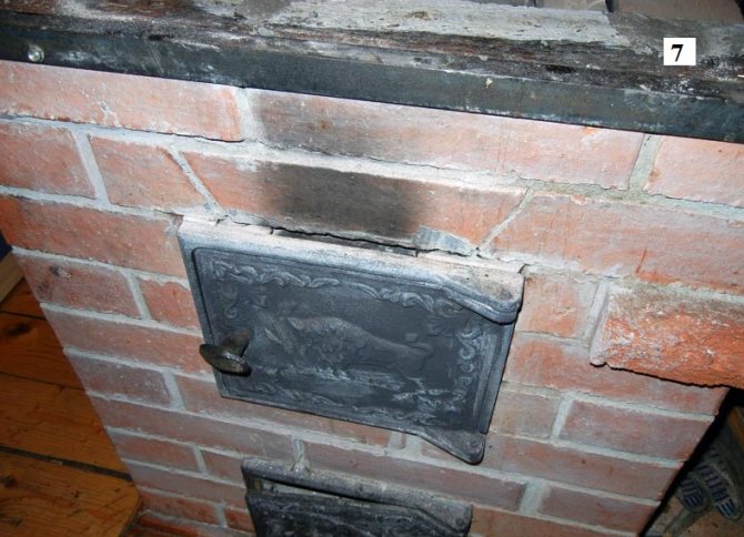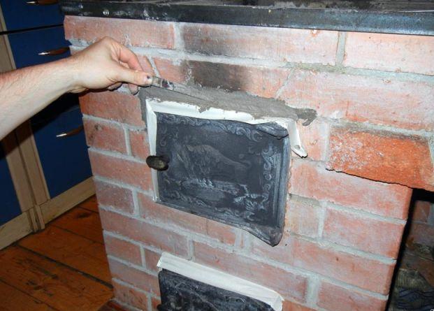 Ремонтната зона около вратата трябва да е без тухли и да се изплаква с вода и твърда четка, за да се отстранят всички остатъци от глина и сажди. След това повърхността се грундира, както в случая с ремонта на страничните повърхности на пещта. Във всички пукнатини около вратата се поставя топлоустойчиво уплътнение и внимателно се запечатва с хоросан.