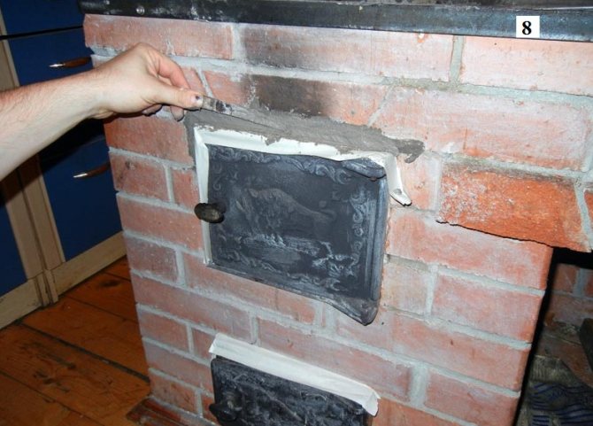 В допълнение към ремонта на самата основа на печката, може да се наложи да укрепите вратата. Обикновено над него се образуват значителни пролуки, а самата врата се клати. При полагане на печките върху рамката на вратата, метални ленти, простиращи се отстрани, се заваряват от противоположни страни, които се зазиждат в зидарията. Следователно премахването на вратата без демонтиране на цялата предна част на фурната няма да работи. И няма нужда от това.Просто трябва да го укрепите, като нанесете достатъчно количество ново решение и инсталирате уплътняващ изолационен кабел. Но тук вече се препоръчва решението да се приготви на базата на шамотна глина с добавяне на топлоустойчиво лепило и в по-малка степен портландцимент. Хоросан се приготвя в съотношение 3: 10: 1, където 3 части глина, 10 части фин пясък, 1 част цимент. Добавете малко топлоустойчиво лепило към готовия разтвор. Консистенцията на разтвора трябва да прилича на гъста заквасена сметана.