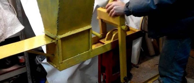 Може да се нарече най-простият, направен от домашни майстори. Сместа се излива в перфориран контейнер за формоване, след което се поставя под леглото. Затегнете винта бавно, за да приложите желаното налягане. Принципът на действие и устройството на такава преса са ясно видими на представената фигура.