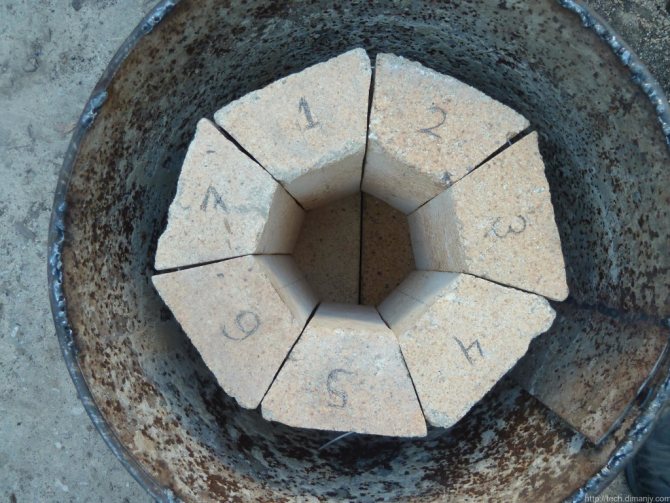 Ръбовете на шамотни тухли се обработват с мелница по такъв начин, че в напречно сечение това е трапец. От такива елементи можете да направите вид огнеупорен пръстен.