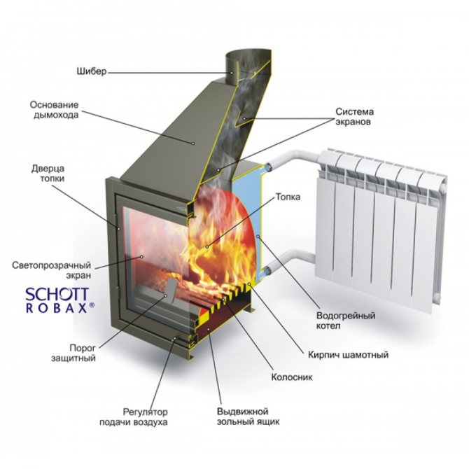 За отопление на други помещения на частна къща в затворена камина е инсталиран топлообменник под формата на резервоар, намотка или водна "риза". Отопляемата охлаждаща течност се подава към радиаторите, веригата може да функционира независимо, както и да бъде свързана към съществуващата отоплителна система.