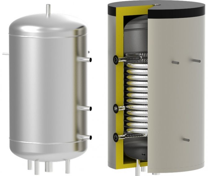 Контейнер с обем до 100 литра е свързан към топлообменника с помощта на тръби. След нагряване на отоплителната система горещата вода се издига през тръбата. Охладената охлаждаща течност се връща обратно към топлообменника. Поради това във външния резервоар се поддържа необходимата температура на охлаждащата течност.