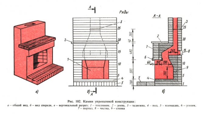 - 6-8 - конструкция на камината. Цветът показва използването на шамотни тухли при полагане на стените на пещта.