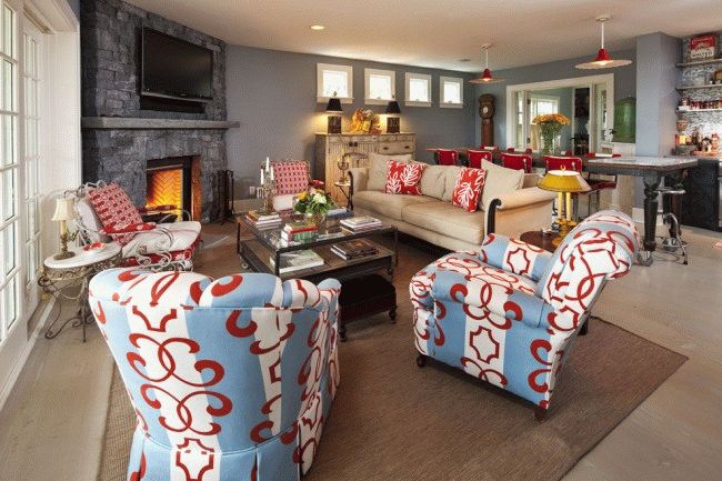 Добре подбраната камина също може да бъде в центъра на стаята, декорирана в оригинална тема. Комбинацията от ярки цветове в обстановката на стаята и самия портал, балансирана от обмислени декорации, създава нестандартен образ на стаята за приемане на гости или за хобита.