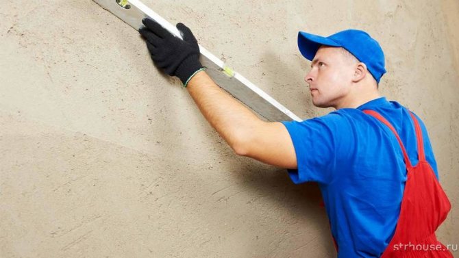 | Както вече споменахме, най-добре е да се работи (особено при липса на опит) върху плоски стени. Тук изглежда всичко е наред с това, но никога не пречи да се провери. Следователно работата започва с контрол - проверка на вертикалността на стената. | |
