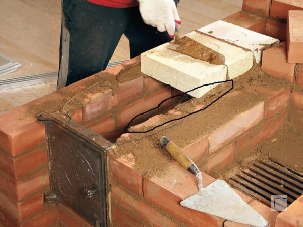 - 12-ти ред: полагане на предните стени на пещта (за това се използват огнеупорни тухли), както и страничните стени на плочата. Затворът на пещта е инсталиран. От лявата страна на печката започва образуването на дъното на комина. Между комина и пещта остава малка дупка, която е затворена със специален летен клапан. След това трябва да направите шаблон за арка от шперплат и дърво.