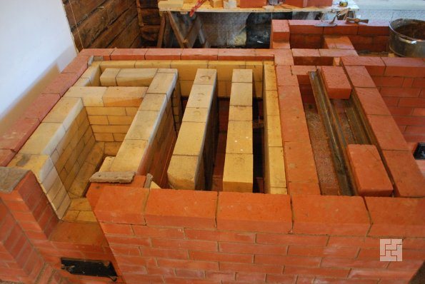 - 8-ми и 9-ти ред: полагането на вътрешни канали и стени продължава. Вратите на печката и малката горивна камера са монтирани, закрепени, както е описано по-горе, с помощта на закалена тел.