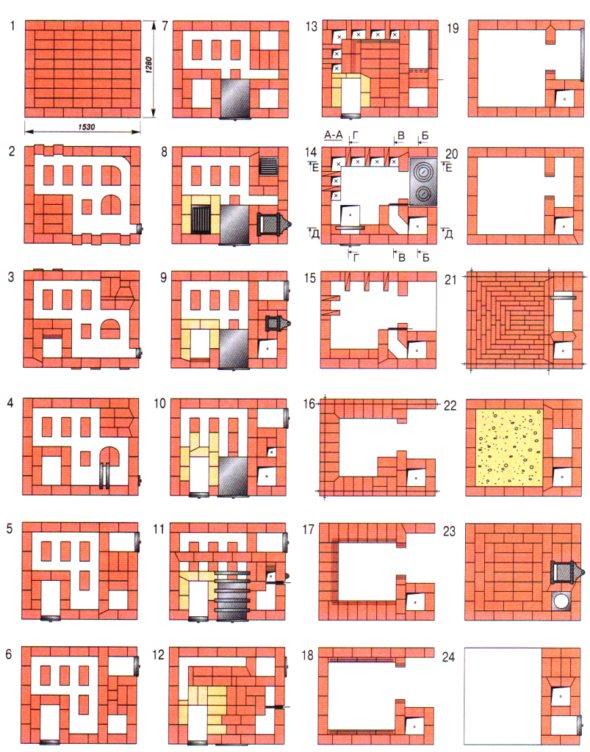 - 5-ти ред: решетката е поставена за най-малката горивна камера. За да се постави вътрешността на горивната камера, се използват огнеупорни тухли, които се полагат без използване на хоросан.