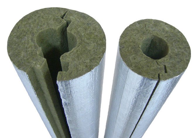 - Огнеупорна минерална вата (базалтова изолация). Тази изолация може да се използва за всякакъв вид.За монтажа на обвивката на желязна тръба с високотемпературна работа се използва базалтова ронлива негорима вълна, тъй като металът има най-висока топлопроводимост. Структурата на черупката се произвежда в готов вид (сандвич) или може да се сглоби на ръка.