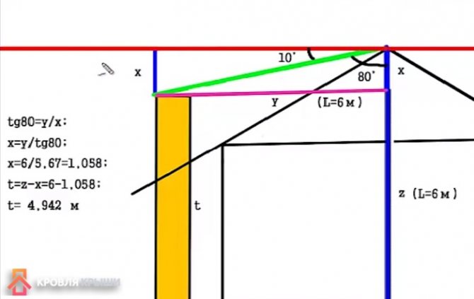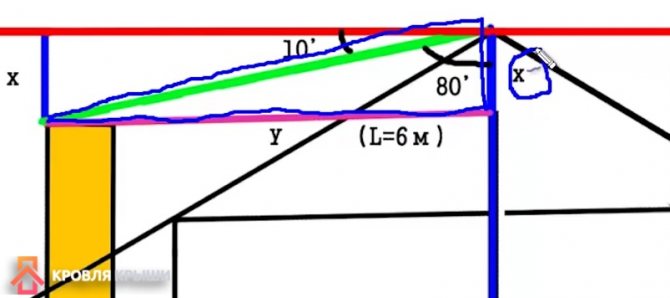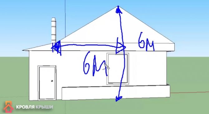 Геометричният метод ще помогне да се гарантира точността на изчисленията: в съответствие с мащаба се извършва схематичен чертеж на покрива с маркирана ос на симетрия на комина (т.е. местоположението вече трябва да е известно), от горната точка (билото) се изчертава хоризонтална линия, успоредна на основата на триъгълника (размах) в точката на пресичане на билото и хоризонталата се полага ъгъл от 10 градуса.