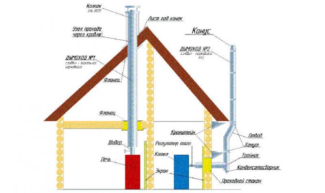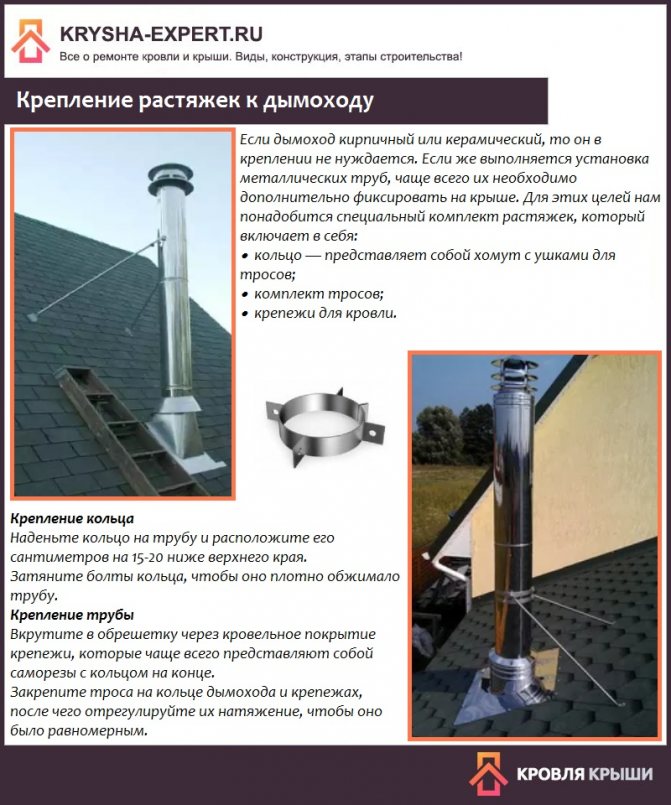 Между покривното покритие и ръба на тръбата извън сградата трябва да има най-малко 50 см. Ако отоплителното гориво е твърдо, тогава добавете още 0,15 м за изграждане на защитна конструкция, материалът от която е метал или гофриран дъска.