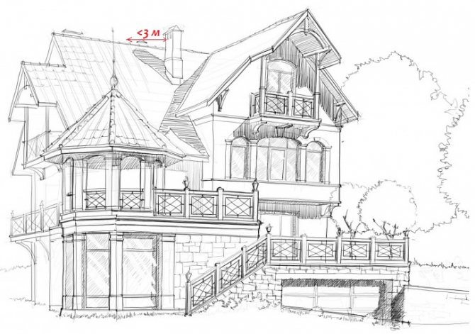 - Когато разстоянието между елементите е 1,5 - 3 м устието на комина трябва да е на едно ниво с билото или малко по-високо от него.