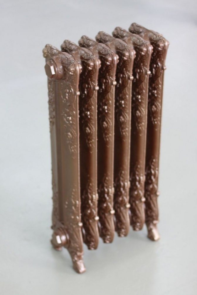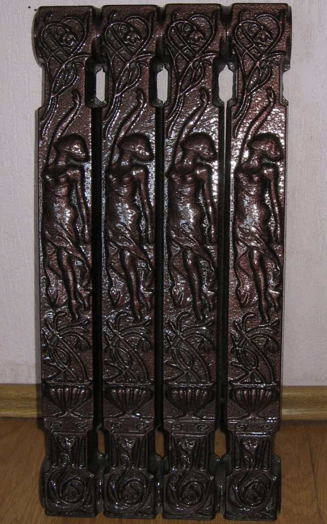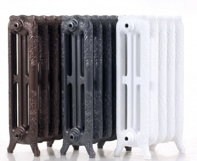 - Чугунените конструкции сега изглеждат стилни, но те също се сглобяват от секции, оборудвани с доста широк канал за охлаждащата течност. Теглото им е станало много по-малко (3,5 кг спрямо 8 кг по-рано), външният вид е представителен и надеждността е същата. На пазара има класически секционни модели и артистични, в ретро стил. Последните са много скъпи и са предимно вносни.