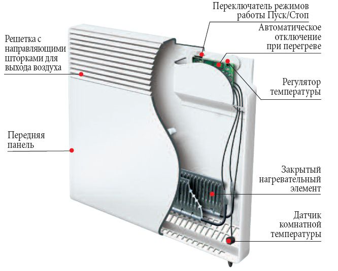 - Конвекция... Дизайнът е проектиран за относително бързо нагряване на въздуха в помещението поради движението на потоци през специални прорези, разположени в горната и долната част на конструкцията;