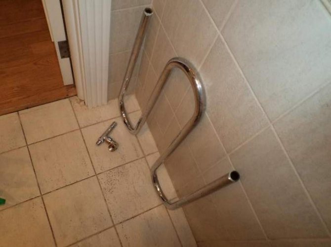 Добре е старата конструкция да е била прикрепена към тръбите с помощта на резбови връзки. След това те могат просто да се развият след източване на водата от системата. Но какво ще стане, ако резбата вече не може да се развие или просто е заварена старата подложка за кърпи? Ще трябва да режем тръби с мелница. Важно е да не забравяте, че след това тези тръби ще трябва да бъдат с резба. За да направите това, оставете парче с достатъчна дължина.