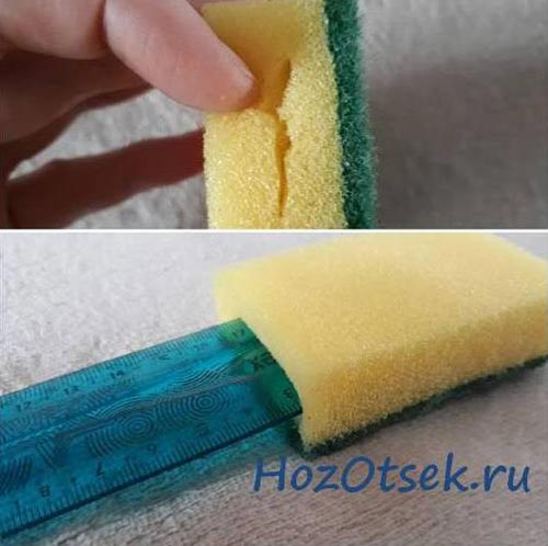 - Пяната гъба може да бъде разрязана наполовина, така че вътре да се образува отвор, и в полученото изрязване може да се вмъкне линийка или всяка широка летва.