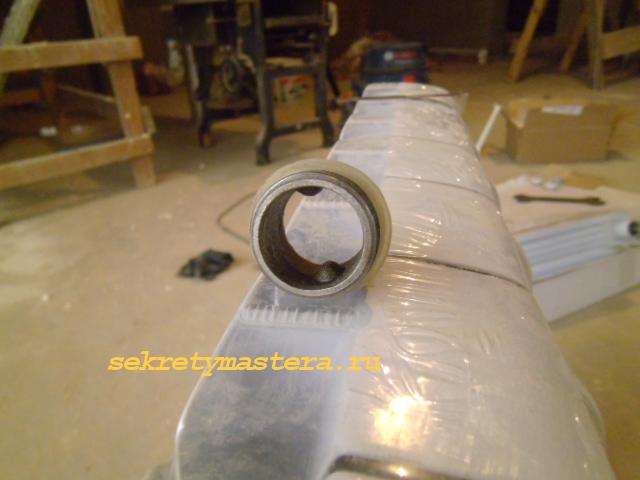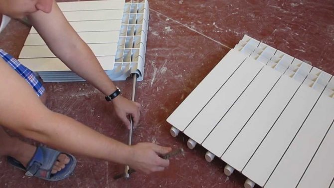След като посоката на резбата се определи и входният елемент се обърне, ние вземаме гнездото и вмъкваме в отвора на радиатора, неговата дръжка, частта, която не е с резба, докато спре. Той ще задейства съединителя, свързващ секциите на радиатора.