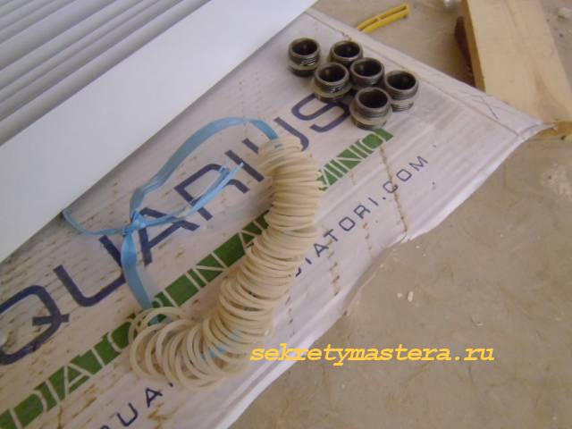 - След като развиете правилните гайки, извадете сегмента и след това проверете всички гарнитури, доставени с него. Качеството и състоянието на гумените уплътнения играят важна роля. Деформираните уплътнения могат да причинят теч. Ето защо, в случай на най-малкото съмнение относно тяхната годност, по-добре е да замените тези елементи с нови. Освен това е препоръчително да закупите паронитови уплътнения, тъй като този материал се е доказал най-добре от всички. Ако това не е възможно, опитайте се да намерите поне силиконови уплътнения. Не се препоръчва да се поставят гумени, тъй като те бързо се провалят.