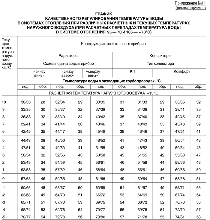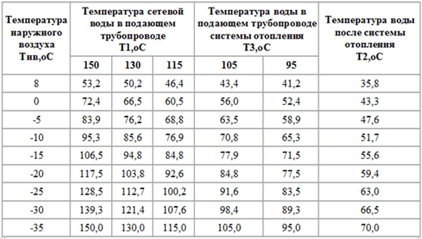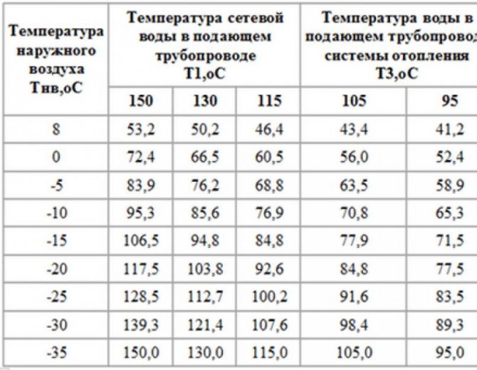Тези цифри показват максималната температура на подаващата и връщащата вода по време на най-силните студове в даден район. Но в началото и в края на отоплителния сезон, когато времето все още не е твърде студено, няма смисъл да се нагрява охлаждащата течност до 105 ° C, така че се изготвя график за отопление с реална температура, където се записва на до каква степен водата трябва да се нагрява при различни външни температури.Зависимостта на отоплението от метеорологичните условия е показана в таблицата, където са представени извадки от графиката за Уфа: