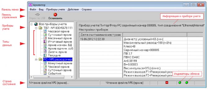 Това устройство има доста големи възможности, като свързване чрез Ethernet, USB, RS-232, но най-важното е, че има четец на SD карти. Просто трябва да поставите SD карта в нея и тя автоматично ще запише цялата история на показанията - налягане, температура, обем на охлаждащата течност и други характеристики, необходими за изчисляване на разходите за отопление. Между другото, в моя случай също се оказа, че ако се използват естествени разходомери (сензор, който изчислява масата на охлаждащата течност), тогава ще бъде възможно автоматично да се записват течове в къщата и да се изпращат SMS до водопроводчика - вие наводнение, тичай в къщата! И така изтеглихме данните от топломера и сега, използвайки програмата Archiver, можем да обработим данните от брояча: