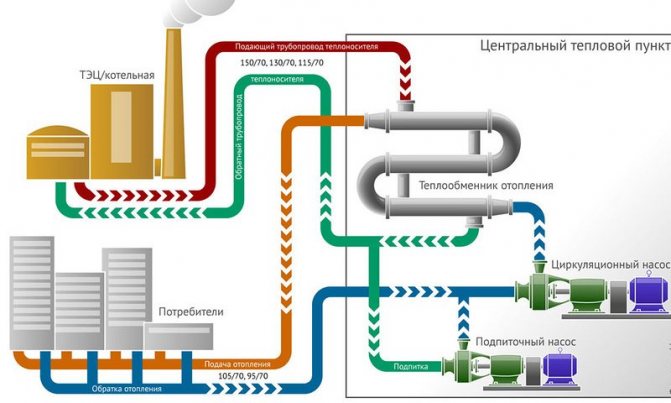 В случай на централизирано топлоснабдяване, източникът на топлина е котелно или когенерационна централа, където са монтирани високотемпературни котли за гореща вода (при ТЕЦ - пара). Природният газ обикновено се използва като гориво, други енергийни носители се използват в по-малка степен. Температурата на охлаждащата течност на изхода на котела е 115 ° C, но водата не кипи под налягане. Необходимостта от отопление до 115 ° C се обяснява с факта, че котелните централи работят с максимална ефективност в този режим.