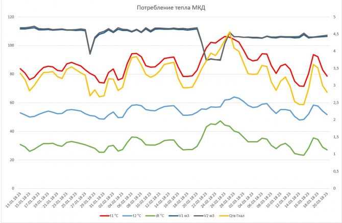 Сега, когато разполагаме с данните в Excel, можем да съставим графики и да направим някои заключения. О, колко можете да видите в класациите! Например, в първата графика има две субсидии в обема на охлаждащата течност (горни тъмносини и сиви линии), преминаващи през къщата, това е най-вероятно повреда на тръбите в района. Просто съвпада с повишаване на температурата на подаване (замръзване!)