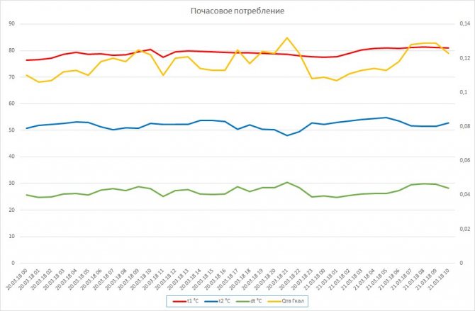 Вижда се, че въпреки скока на температурата на подаване, температурата на връщане винаги е приблизително една и съща. Това е интересно явление. Някой знае ли защо? Имам версия, но засега ще я оставя при мен, отидете на коментарите!