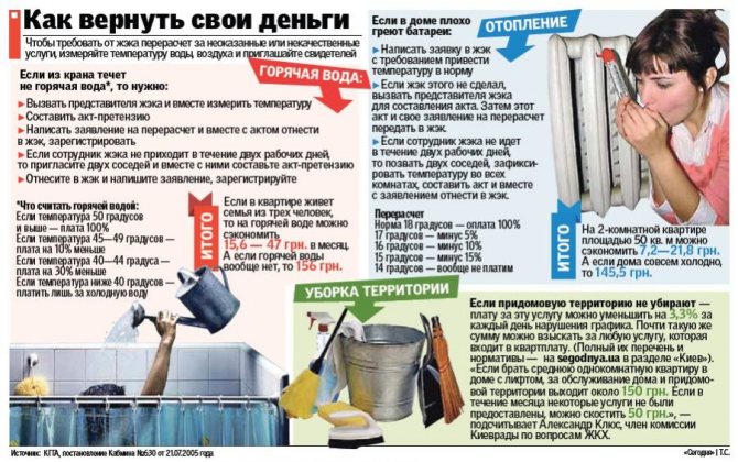 Когато продължителността на ремонтните мерки надвишава времето, определено съгласно нормите, доставчикът на топлинна енергия е длъжен да преизчисли плащането, стойността му се намалява с 0,15% за всеки допълнителен час на изключено топлоснабдяване. Съгласно правилата, същото преизчисляване трябва да се извършва през цялото време, когато температурата в апартаментите е по-ниска от допустимата (18 ° C). В този случай приспадната сума на плащането не може да бъде по-голяма от сумата за целия период, когато не е подадено достатъчно топлина към радиаторите за отопление. В някои случаи регламентът позволява пълно освобождаване на засегнатите жители от заплащане.
