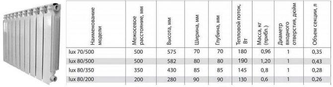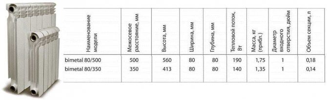 Мощността на една секция е 180 W; едно отоплително устройство може да съдържа от 4 до 14 парчета. Останалите технически характеристики на чугунените радиатори Konner са показани в обобщената таблица.