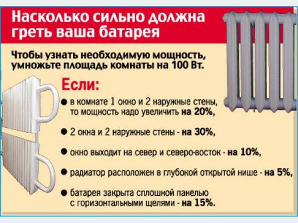 Въз основа на такива данни, топлинната мощност, необходима за отопление на помещение с площ от 10 кв. m е 1000 W. Получената мощност се разделя на топлопредаването на една секция - в резултат на това получаваме необходимия брой секции (или ние избираме подходящ стоманен панел или тръбен радиатор).