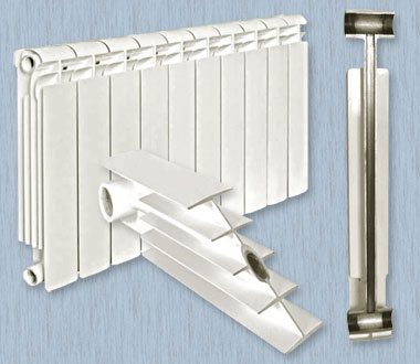 - Биметалните отоплителни радиатори са комбинация от стоманени и алуминиеви части. Топлоносителите и крепежните елементи в тях са стоманени тръби и резбови съединения, покрити с алуминиев корпус. Недостатъкът е доста високата цена.