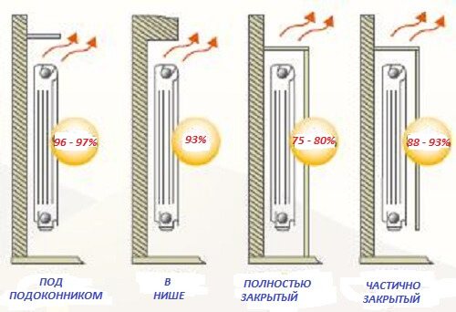 Съществуващите или изкуствено създадени бариери могат значително да намалят ефективността на батерията поради влошаване на обмена на топлина с помещението. В зависимост от тези условия коефициентът е: