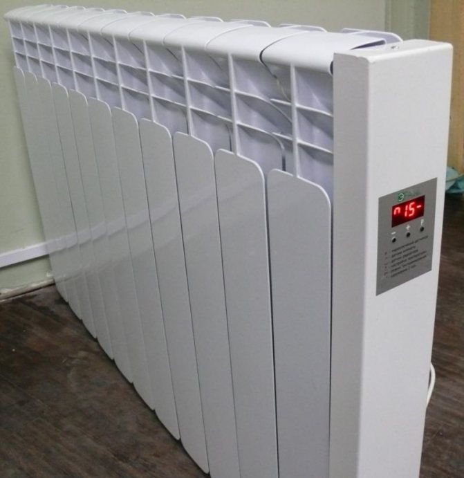 Следващите икономични електрически батерии са сходни по дизайн с традиционните маслени радиатори. Само тук няколко алуминиеви секции, обединени в едно отоплително устройство, са пълни с течност против замръзване. В долния хоризонтален колектор е поставен нагревателен елемент, който загрява тази течност. В резултат на това по-горещата среда се издига до горната зона на батерията, отделя топлина и се връща обратно към нагревателния елемент. Тоест, има постоянна циркулация на охлаждащата течност вътре.