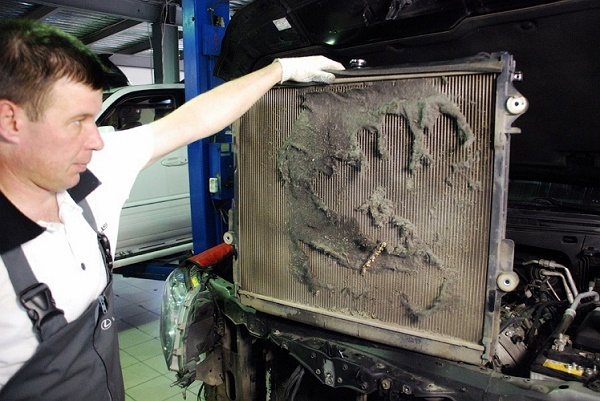 Работа на открито... Те са включени във външното измиване на всички компоненти на охладителната система. Тоест, ние отмиваме от него прах, мръсотия, пясък и т.н. Също така е необходимо внимателно да се измият насекомите, прилепнали към него, от пчелната пита на радиатора.