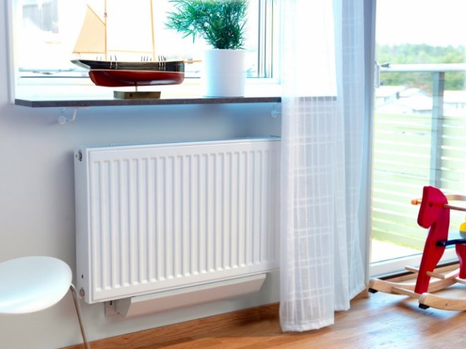 При инсталиране на отоплителни устройства под отвори на прозорци, височината на радиаторите трябва да се изчислява, като се вземе предвид разстоянието от перваза на прозореца до пода, докато долният ръб на устройството трябва да е на поне 100 mm от повърхността на пода, а горният ръб - на 100 мм от перваза на прозореца.