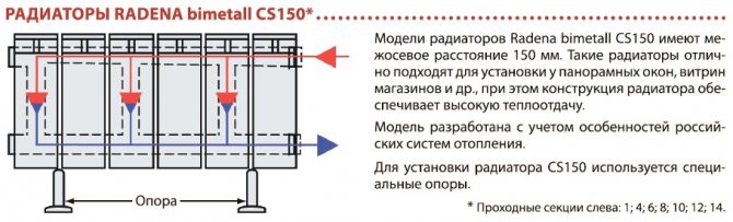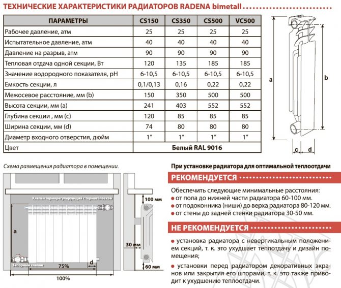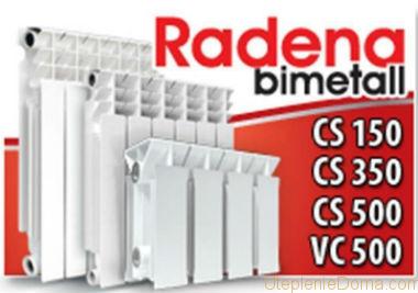 Биметалните радиатори "Radena", представени в продажба като секционни продукти, са обозначени като CS 150, CS 350, както и CS 500 / VC 500. Всички те могат да работят при налягане 25 атмосфери, изпитвателното налягане за всички три модела е 40 атмосфери, докато налягането на спукване е еквивалентно на 90 атмосфери. Температурата на охлаждащата течност също не се различава и е 110 ° C, същото не може да се каже за топлинната мощност на една секция. В първия случай параметърът е 120, във втория - 135, докато в третия - 185 вата.