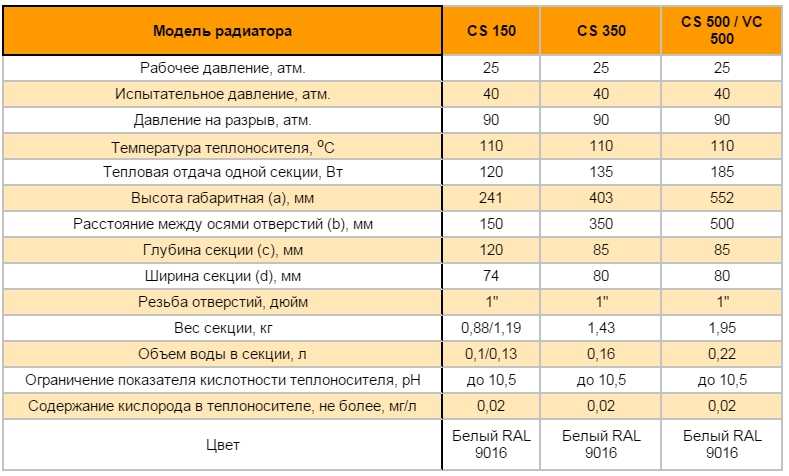 Технически характеристики на секционните биметални радиатори от различни модели