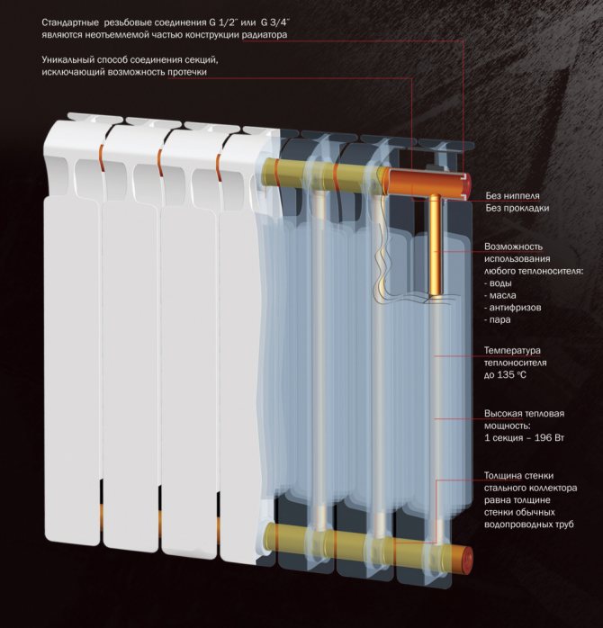 Биметалните батерии Rifar имат сърцевина, направена от специална стоманаспособен да издържа на значителни натоварвания, той има нисък топлообмен, докато алуминиевите ребра, напротив, имат висок топлопренос.