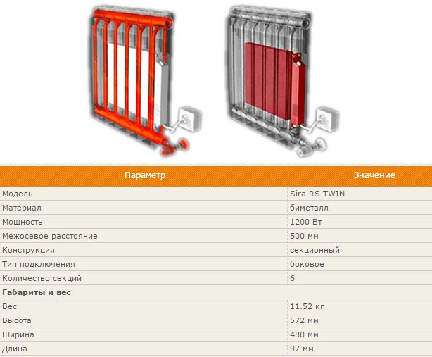 Биметалните радиатори на модела Sira RS 500 Bimetall се считат за най-продаваната марка, тъй като стандартните параметри позволяват инсталирането на батерии във всяка стая. В същото време компактността не влияе върху качеството на отоплението. Двете вътрешни вертикални стоманени тръби са отлити от висококачествена алуминиева сплав под налягане. Този метод на производство осигурява единична структура без заварки. Радиаторите с брой секции от 4 до 12 влизат в продажба, но можете да поръчате до 20 бройки. Максимално налягане - 40 атмосфери, пренос на топлина - 200 W, тип връзка - странично.